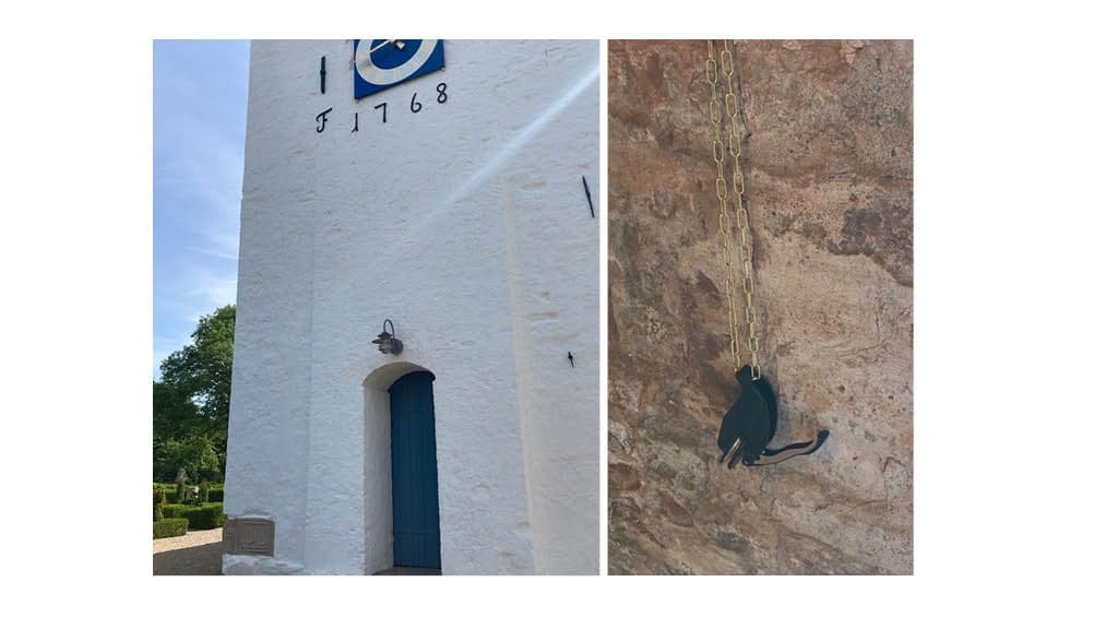 Finden Sie die Briefmarke: Die Briefmarke hängt im Glockenturm der Kragelund Kirche. Gehen Sie durch die blaue Tür, und sie hängt an der Wand.